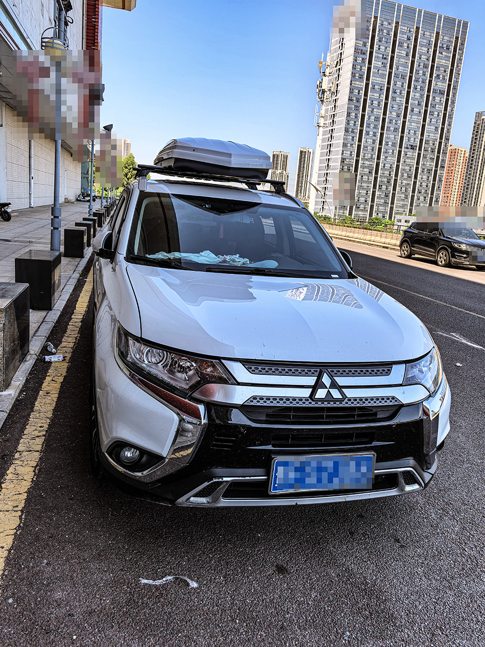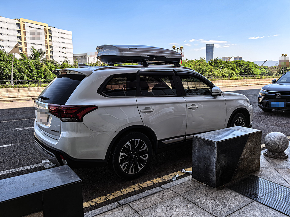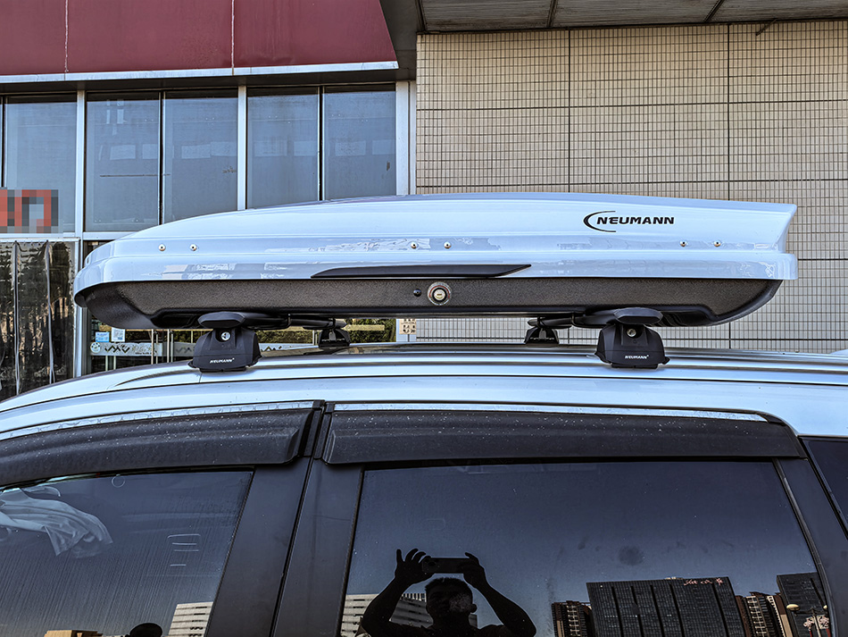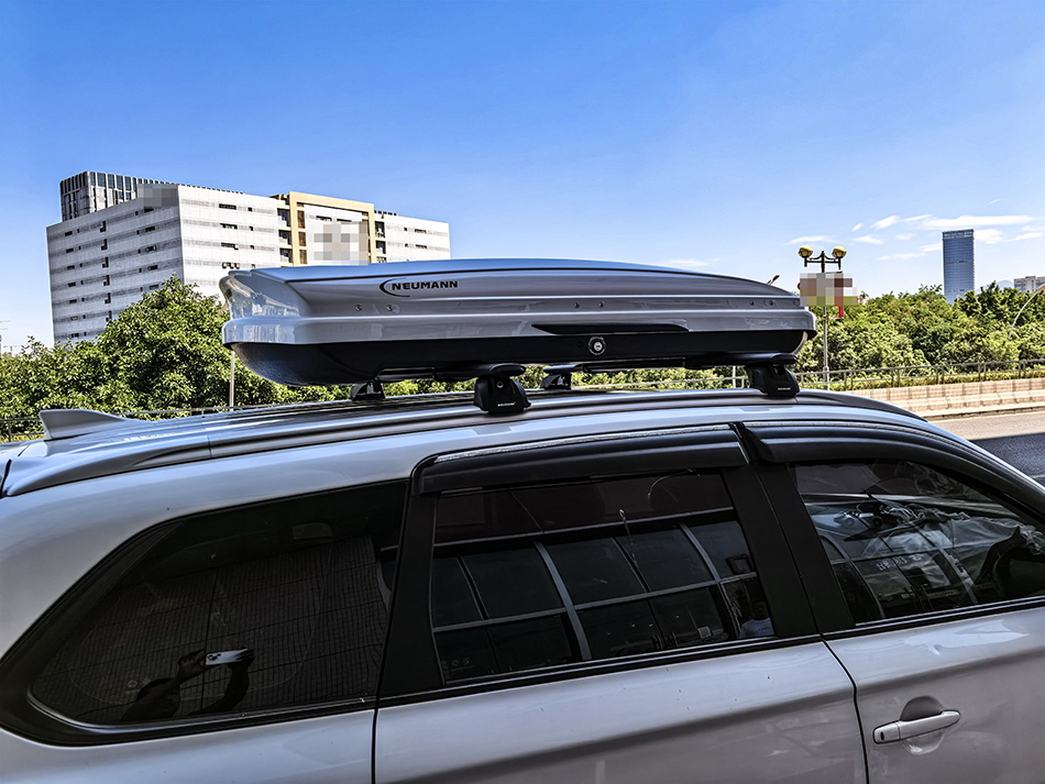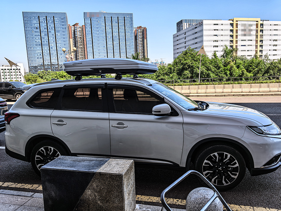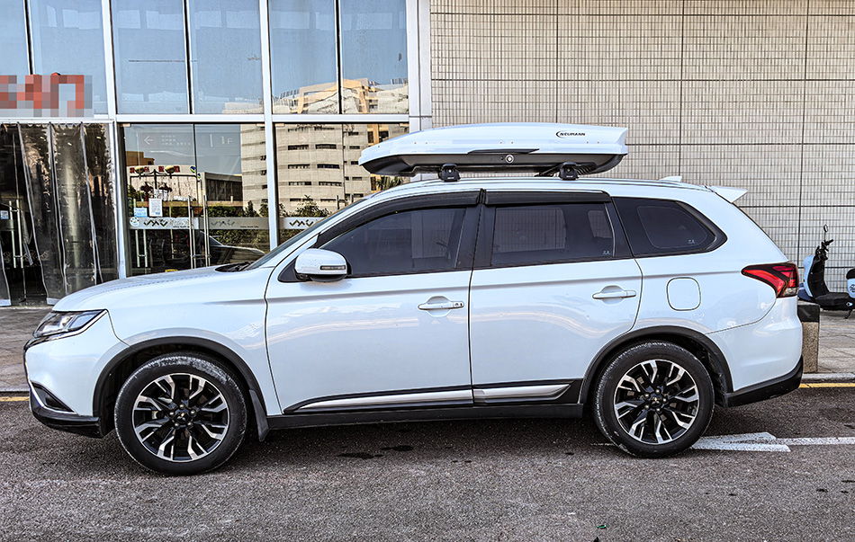 三菱欧蓝德安装纽曼307s车顶架+C5A车顶箱白色,安装效果很好