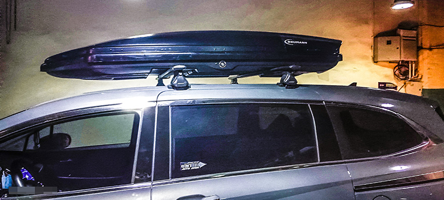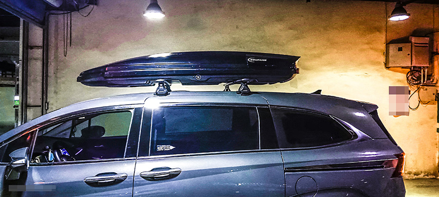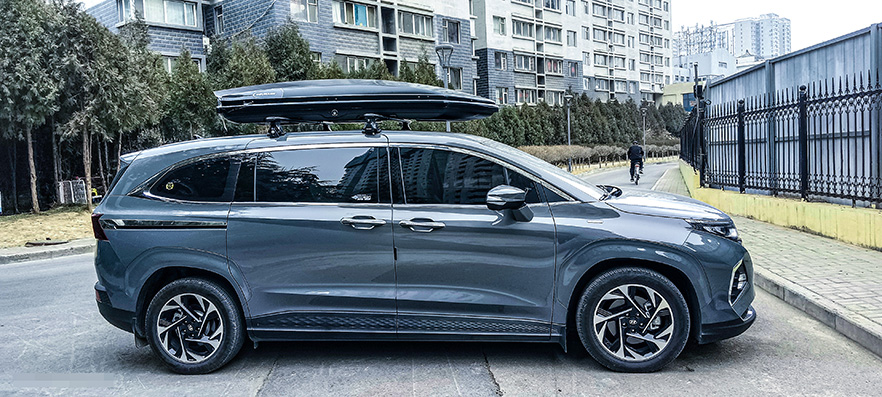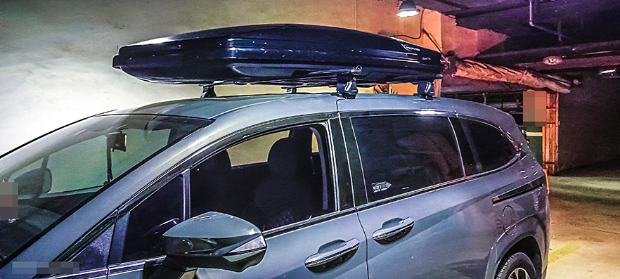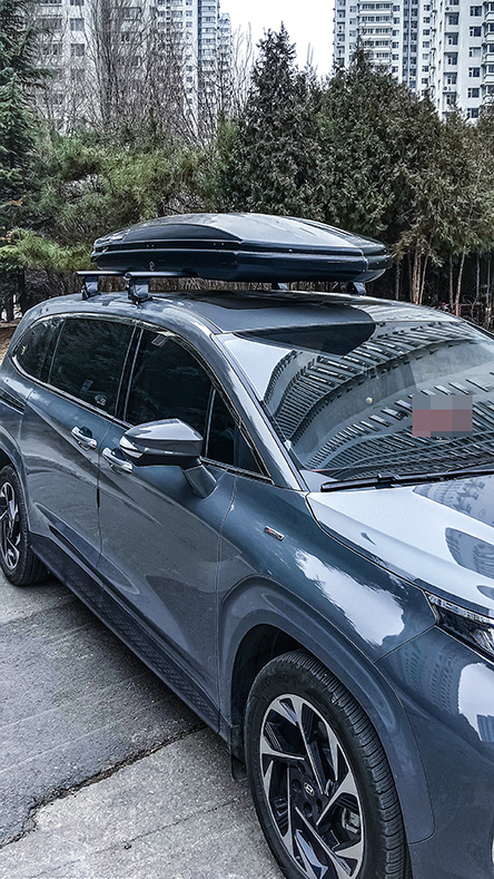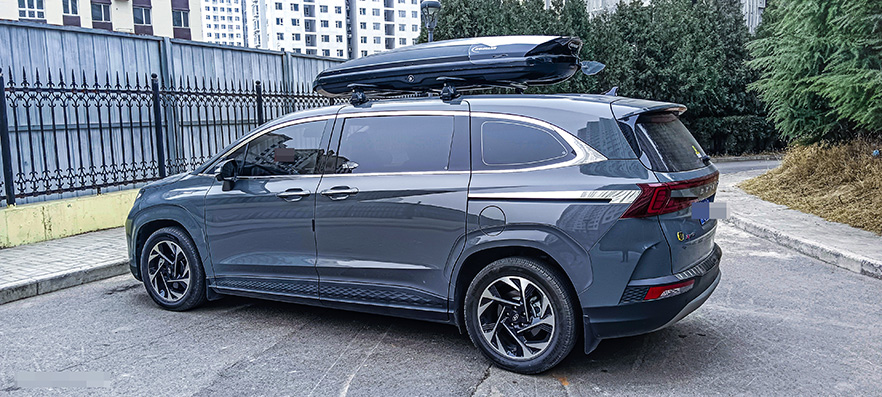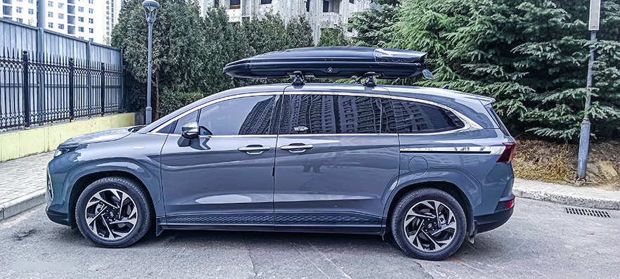 现代库斯图搭载纽曼305s车顶架+K6车顶箱黑色,横杆贴合度很好,非常稳合