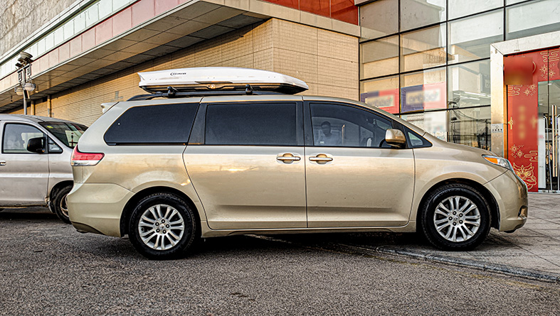商务车丰田塞纳搭载纽曼G5款车顶箱,G5尺寸206*82*34cm,协调度好。