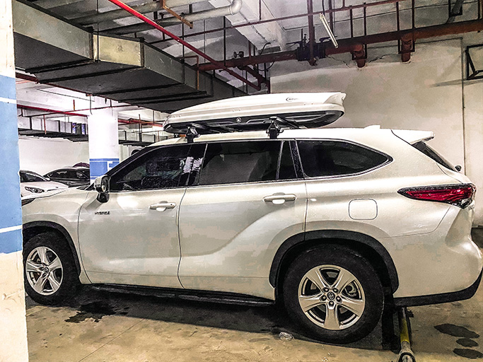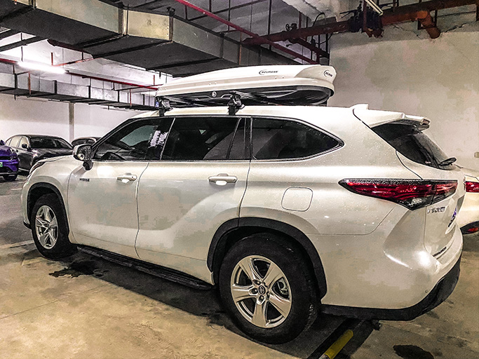 丰田汉兰达搭载纽曼305s车顶架+G5车顶箱白色