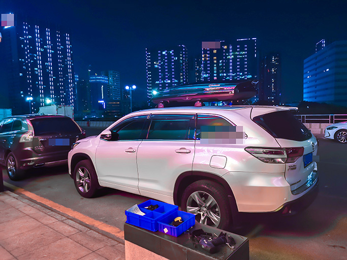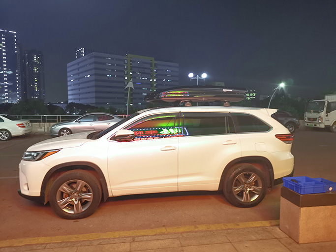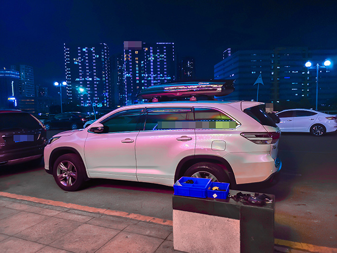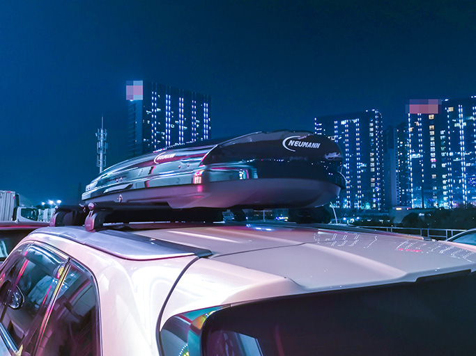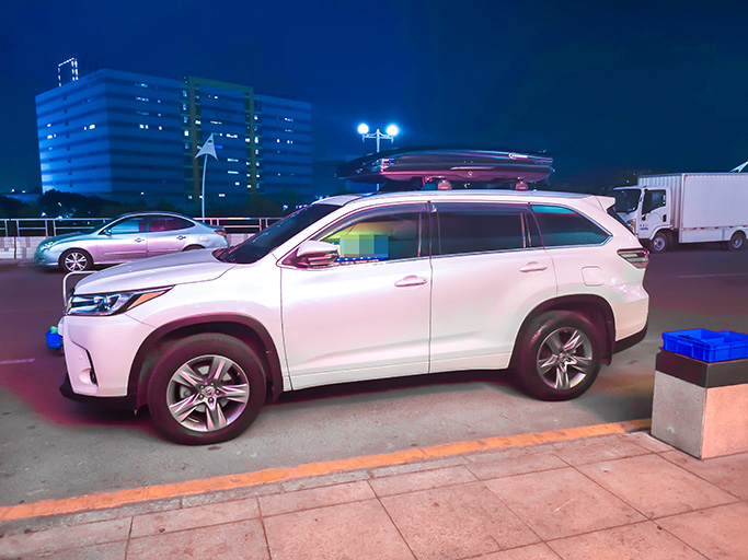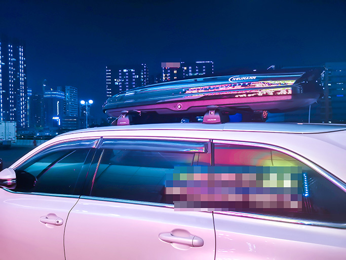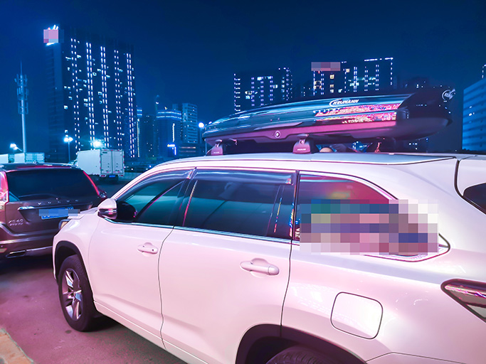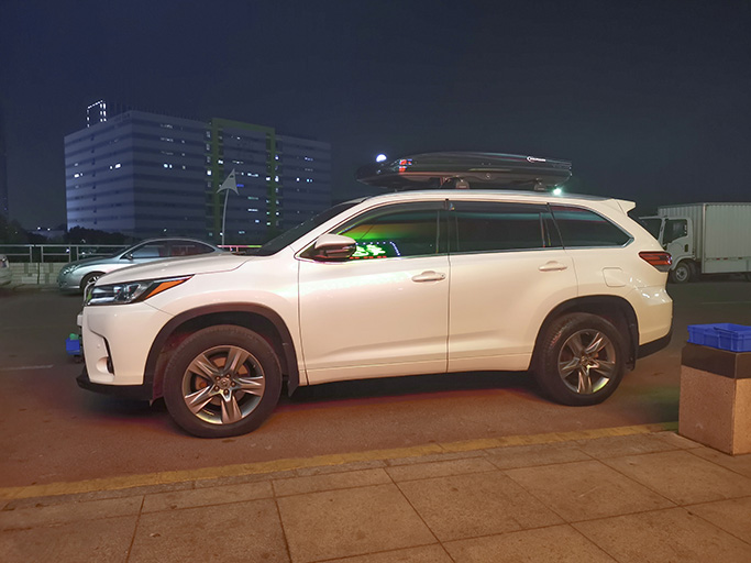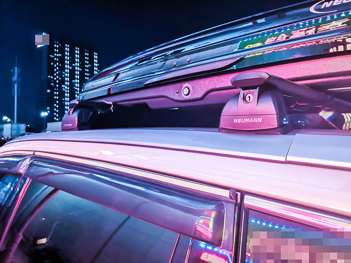 丰田汉兰达安装纽曼308车顶架+G5车顶箱黑色206*82*34cm。