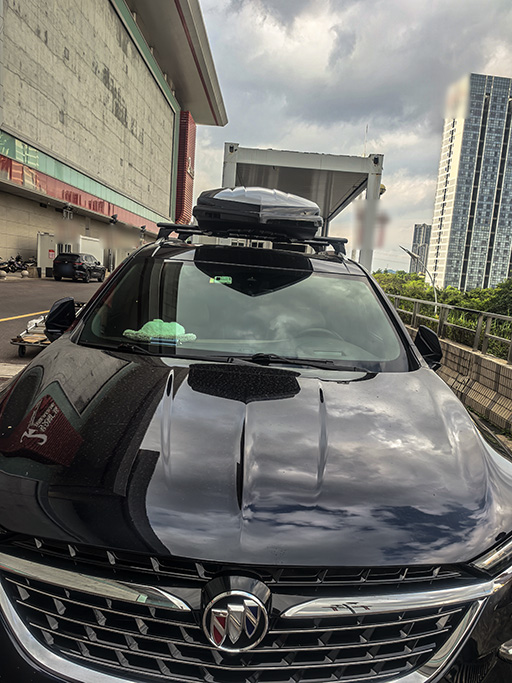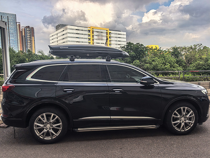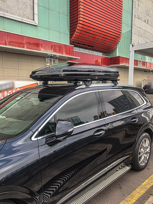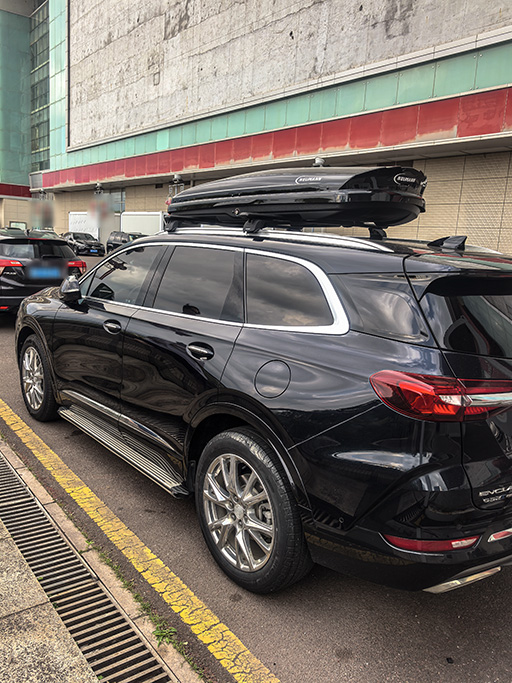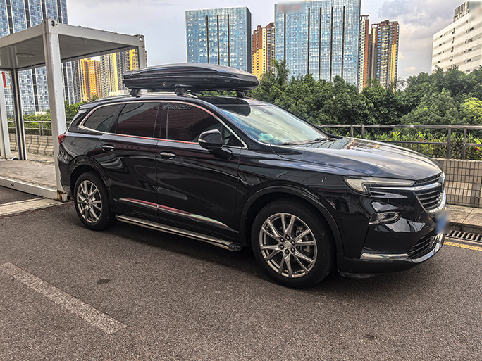 别克昂科旗安装案例,纽曼307s车顶架+G5车顶箱黑色。
