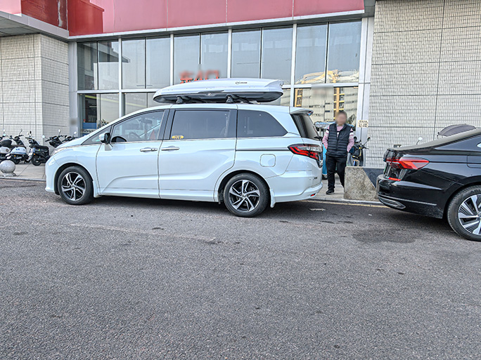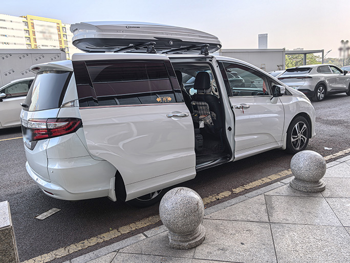 本田奥德赛安装案例,纽曼305s车顶架+K6车顶箱白色,这个颜色搭配也好看的。关键还非常的实用,容积大。