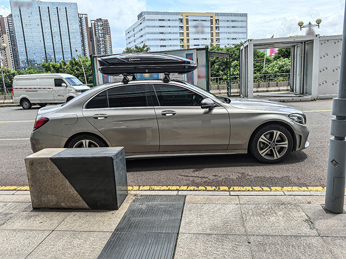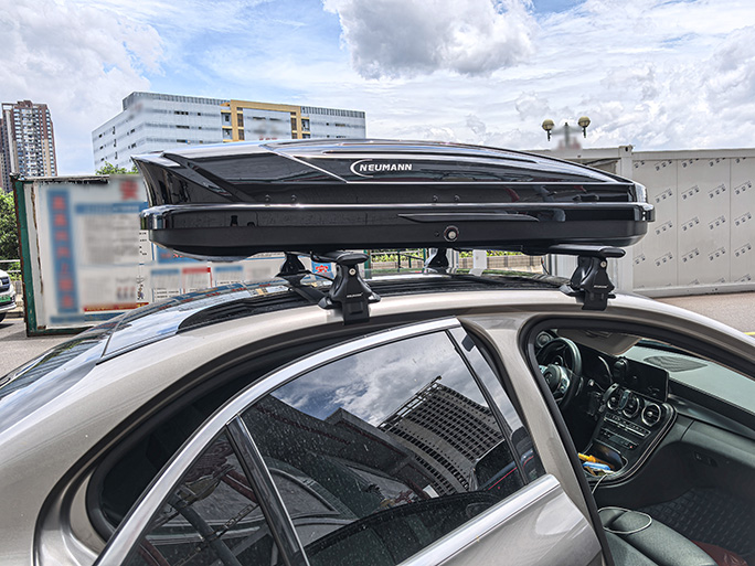 奔驰C260安装案例,纽曼305s车顶架+C5B车顶箱,超大容积车顶箱。