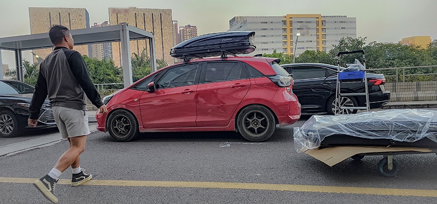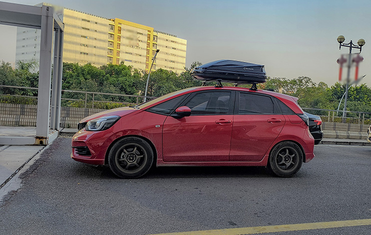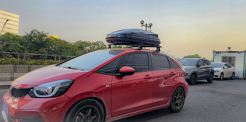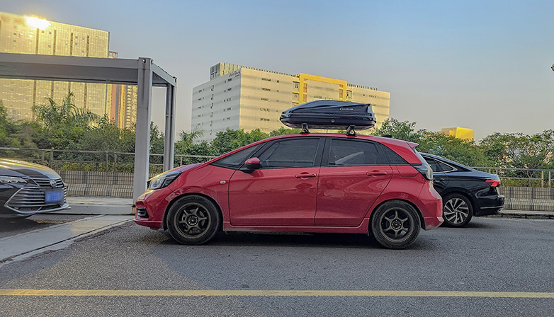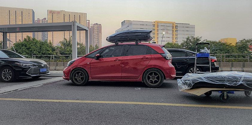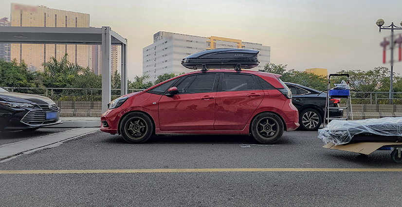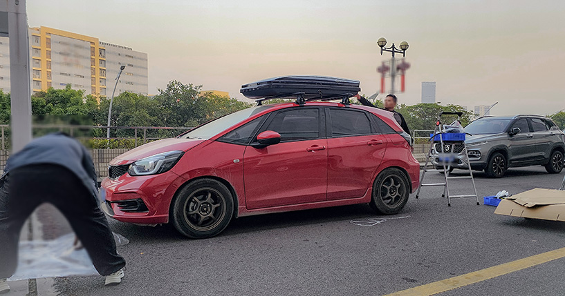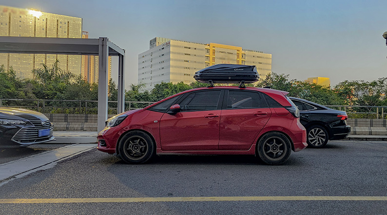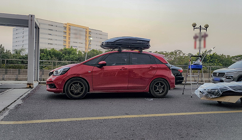本田飞度安装案例。纽曼305s车顶架+C5C。A8、C5A不同型号车顶箱。不同型号搭载也能搭出不同的效果,容积超大。