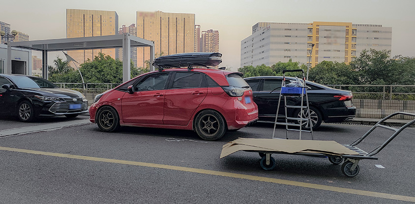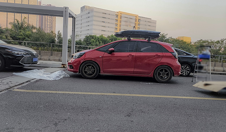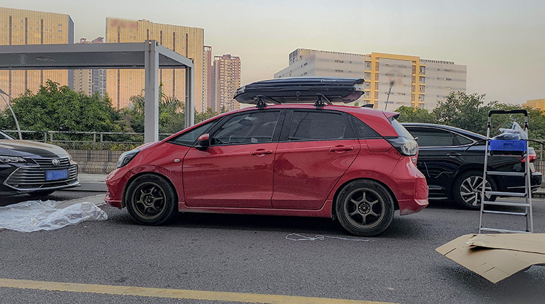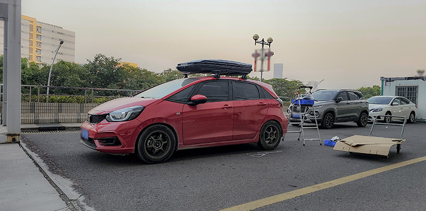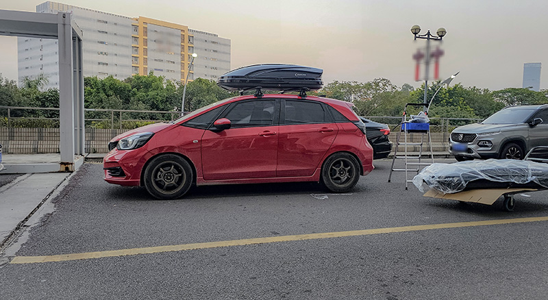 本田飞度安装案例。纽曼305s车顶架+C5C。A8、C5A不同型号车顶箱。