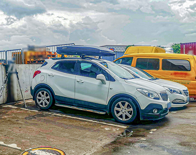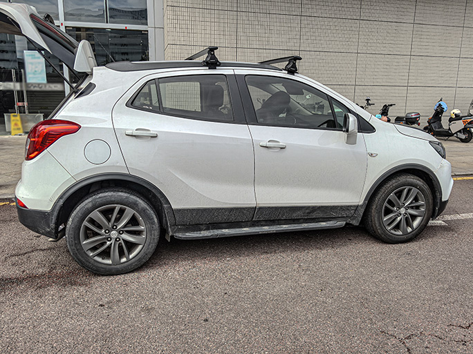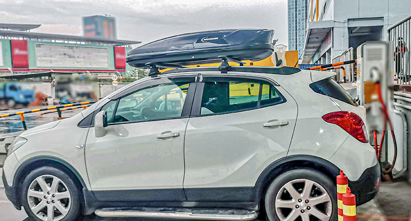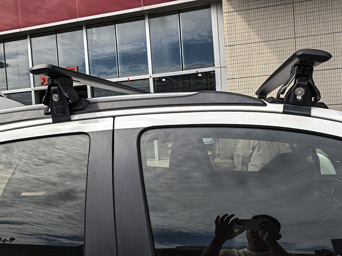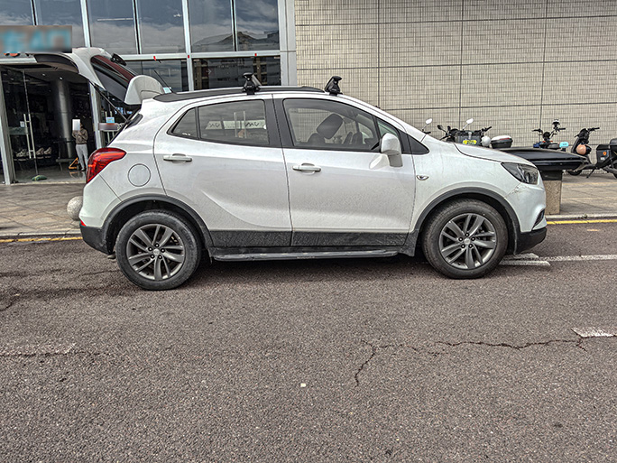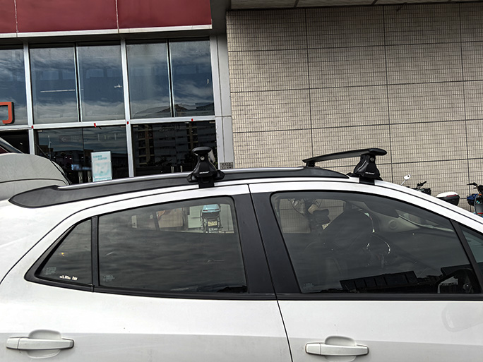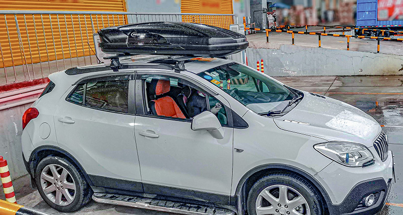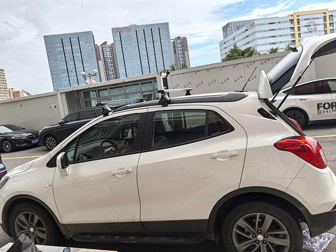 别克昂科拉安装案例,纽曼305s车顶架+车顶箱行李箱,专车专用横杆,勾片贴合安装牢固。
