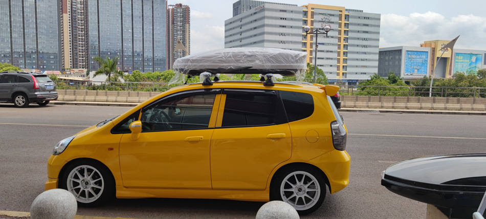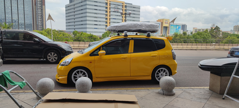 本田飞度安装纽曼专用305s车顶行李架,纽曼C5B车顶箱+欧款扰流板