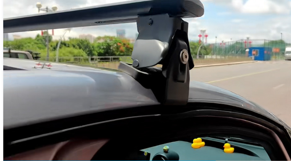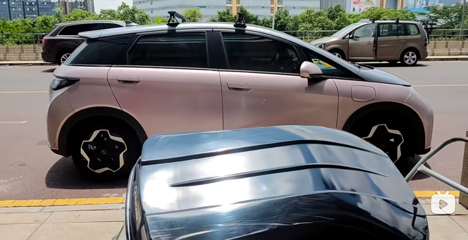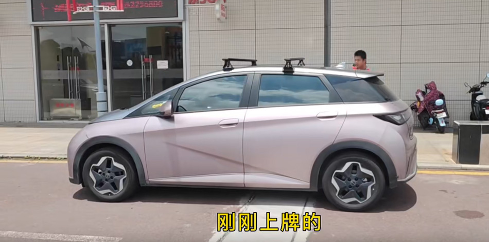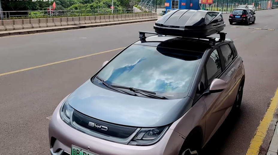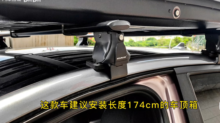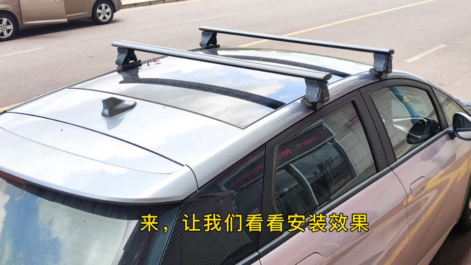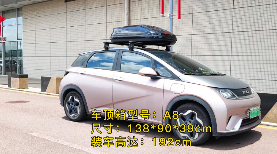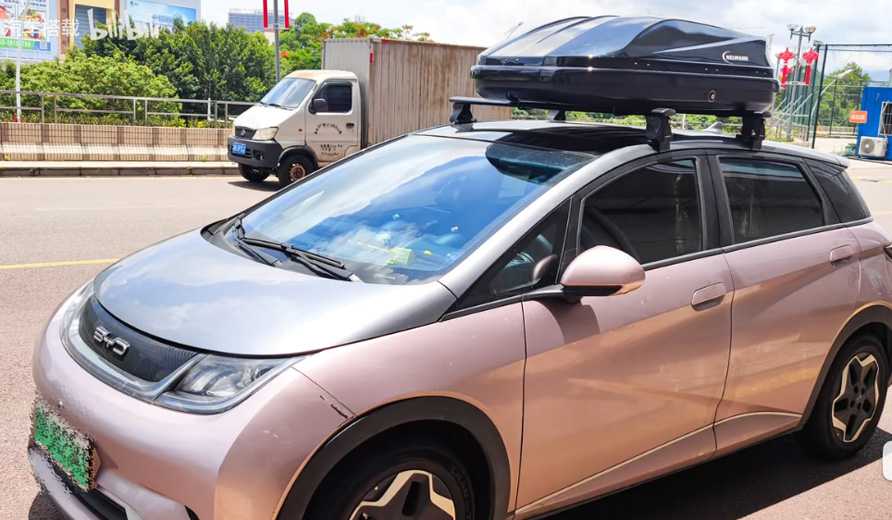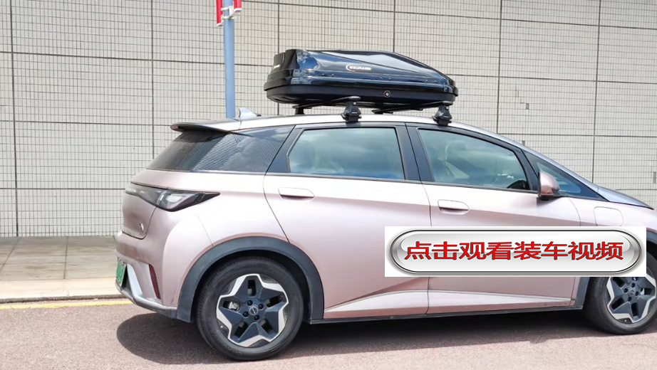 比亚迪海豚搭载纽曼专用305s车顶行李架+车顶箱A8,安装效果好,冰梅粉海豚车