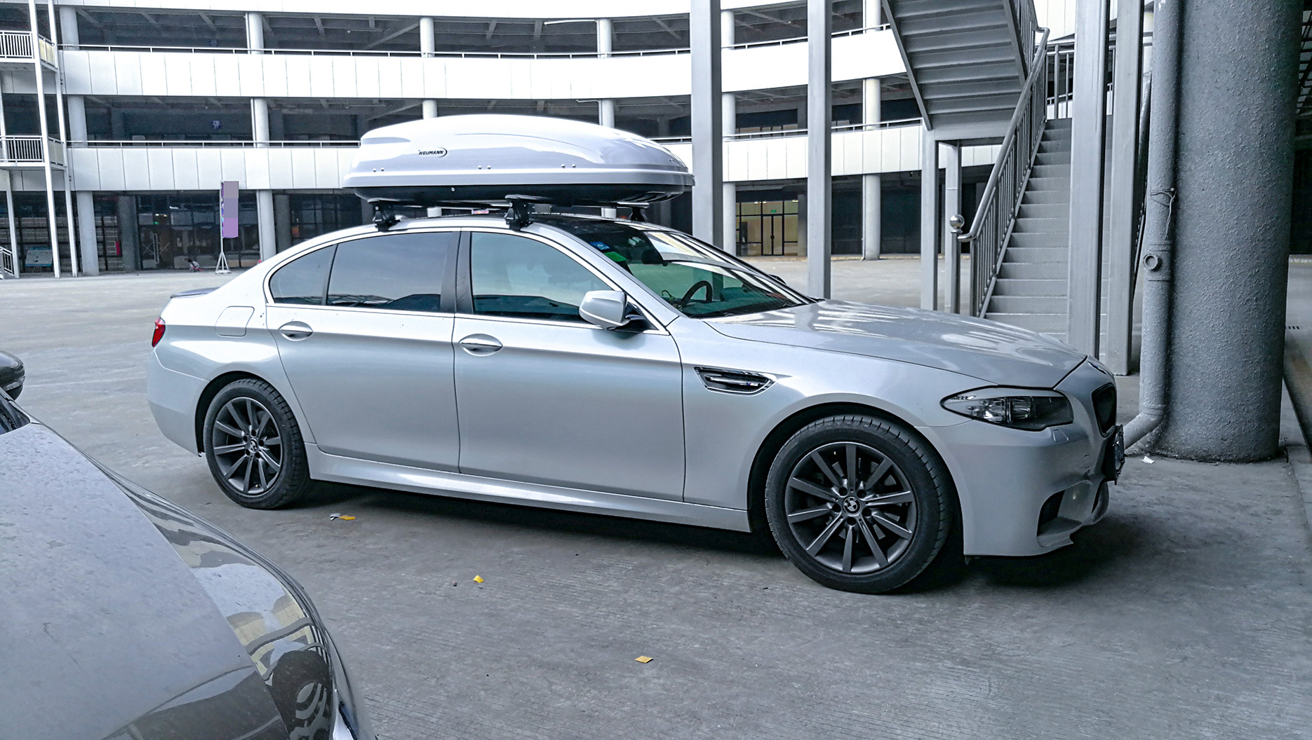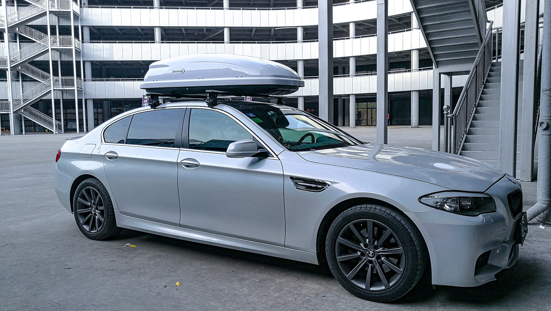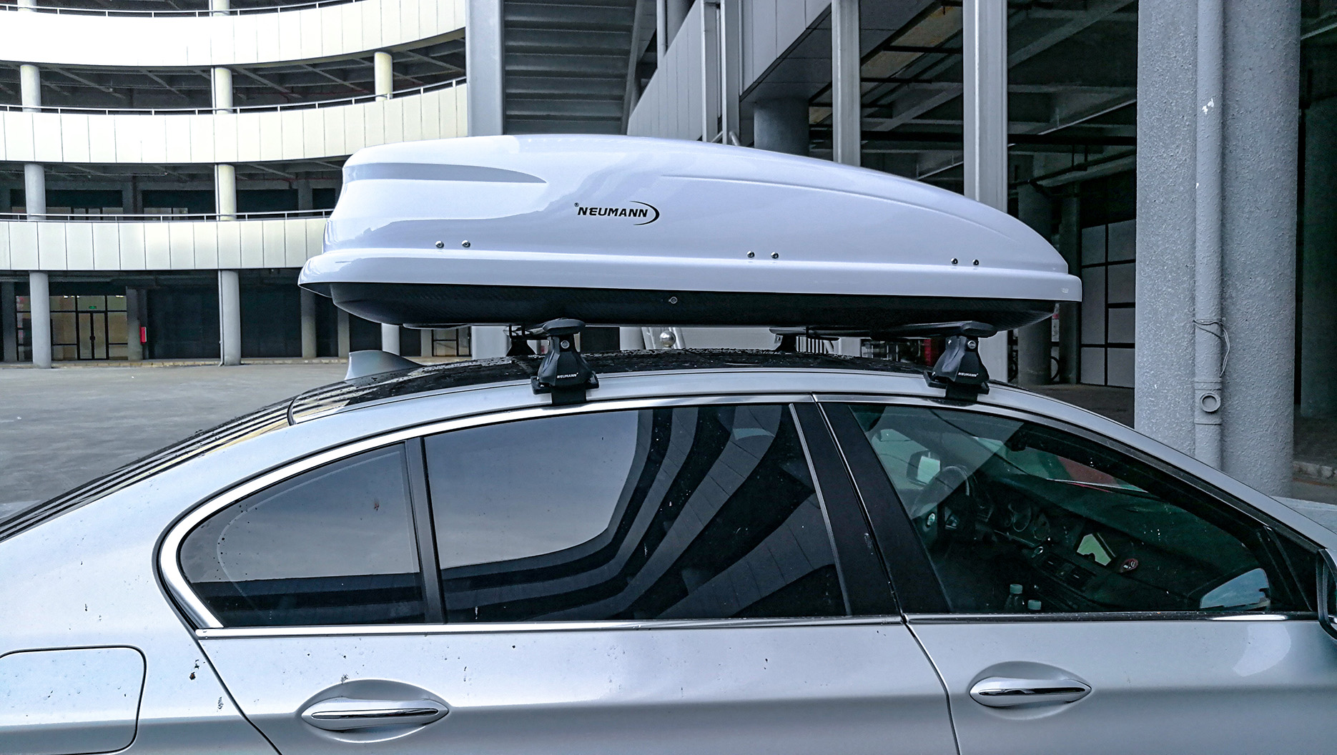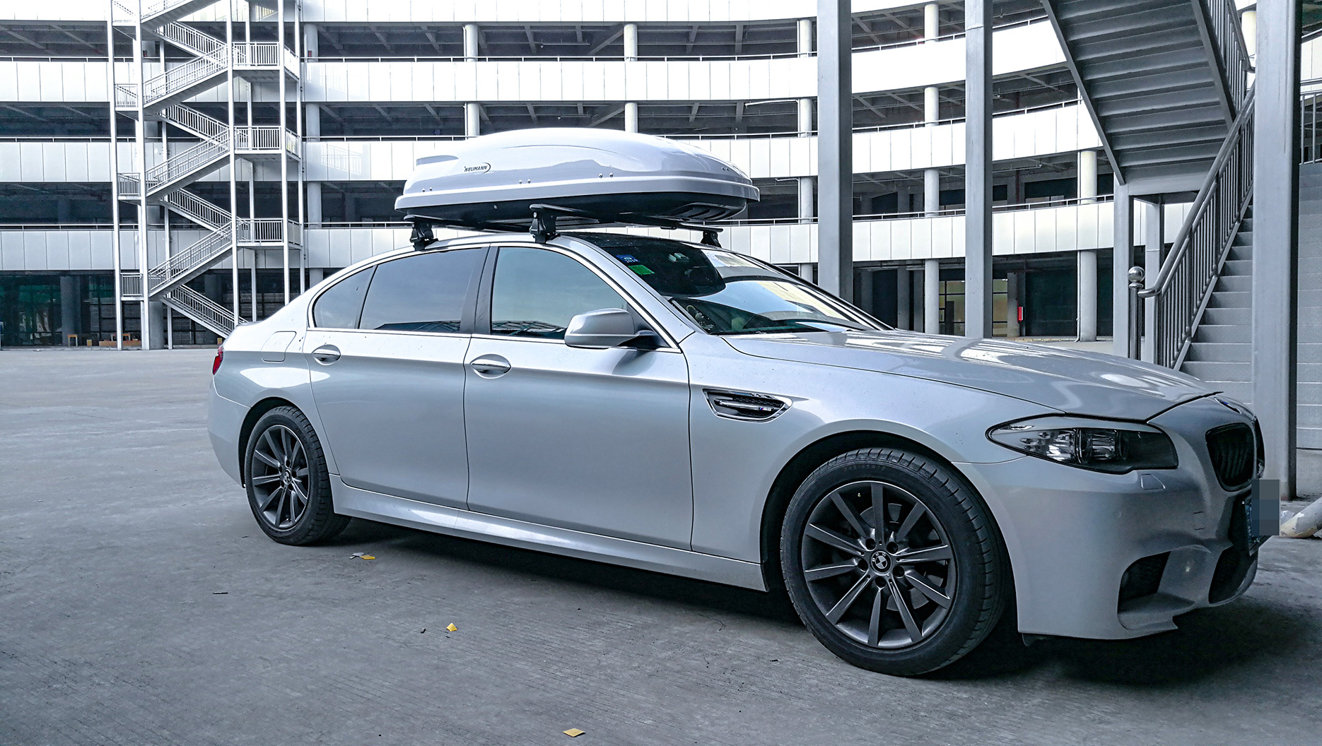 宝马5系搭载纽曼305s车顶行李架,纽曼D6大海豚车顶行李箱
