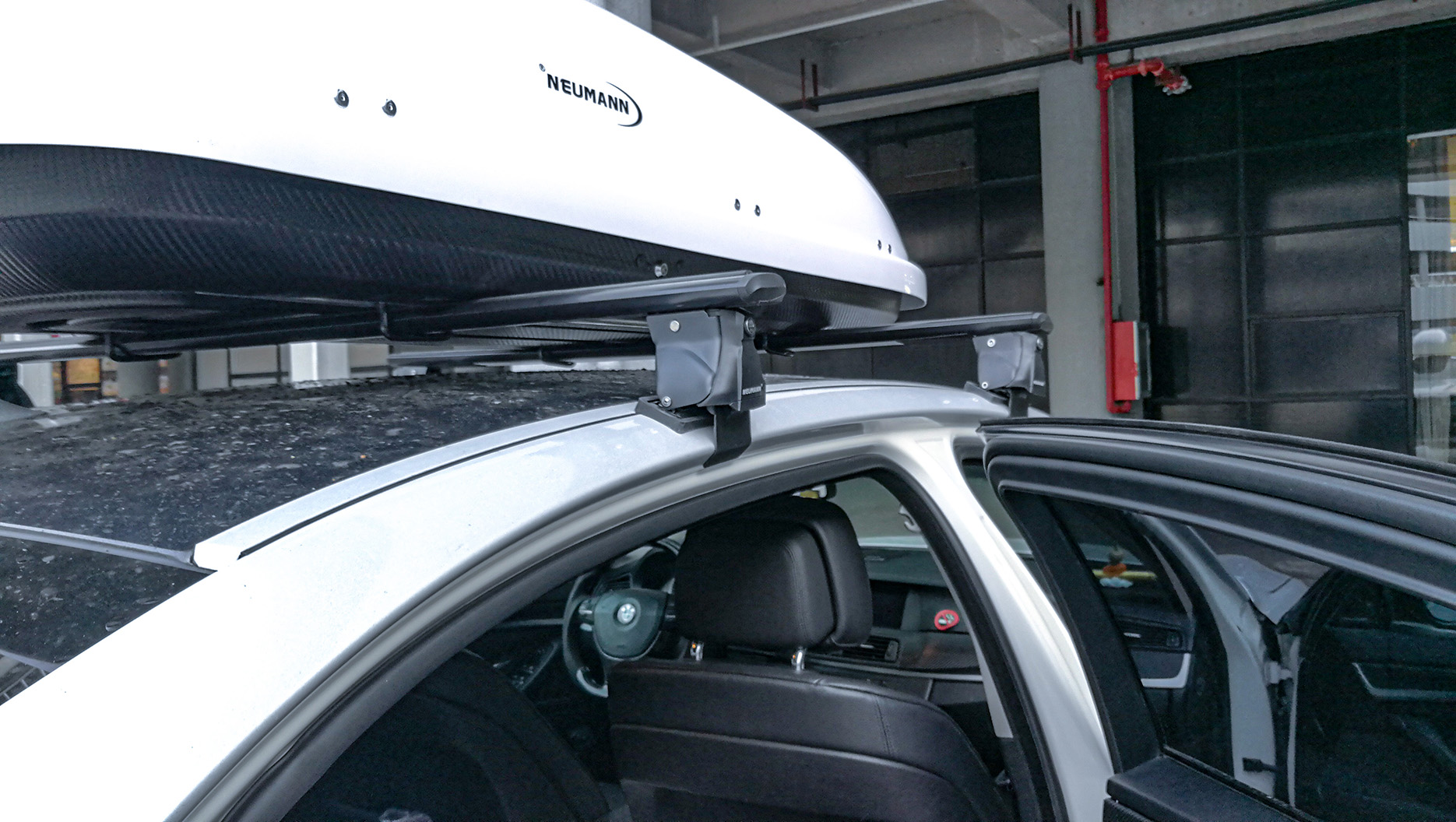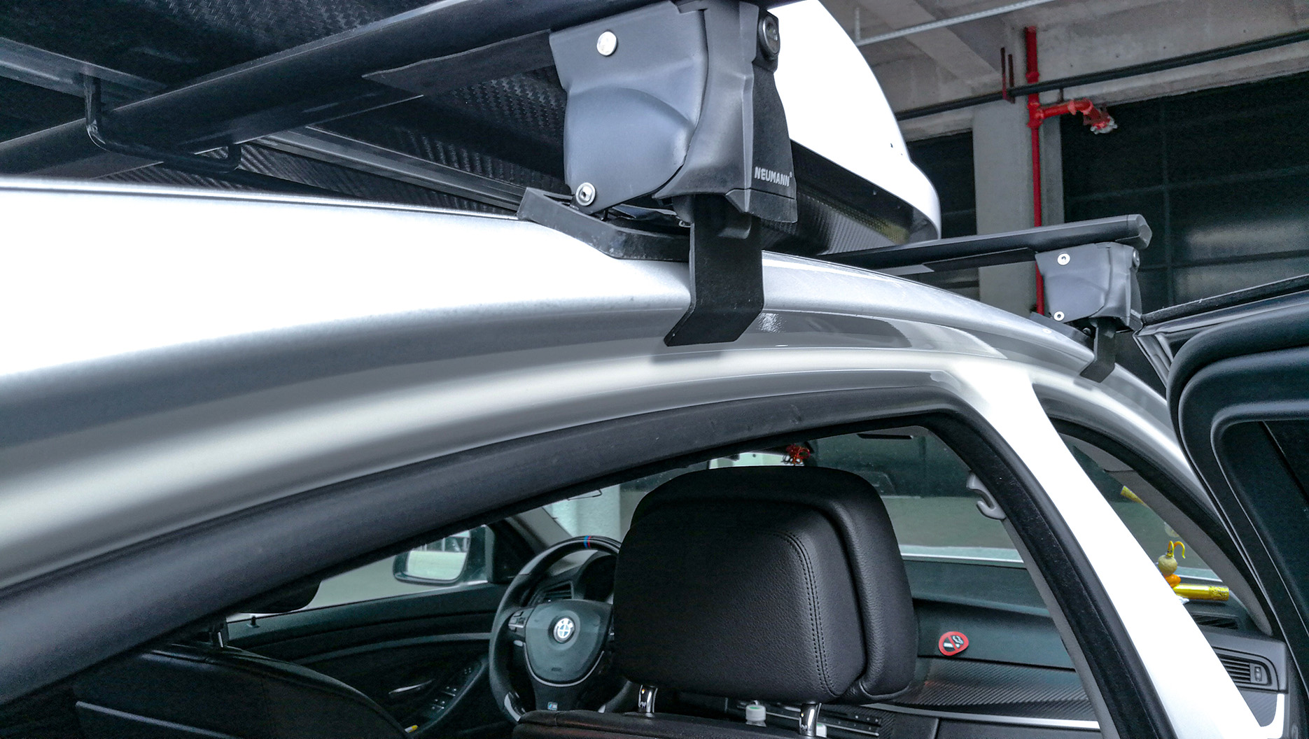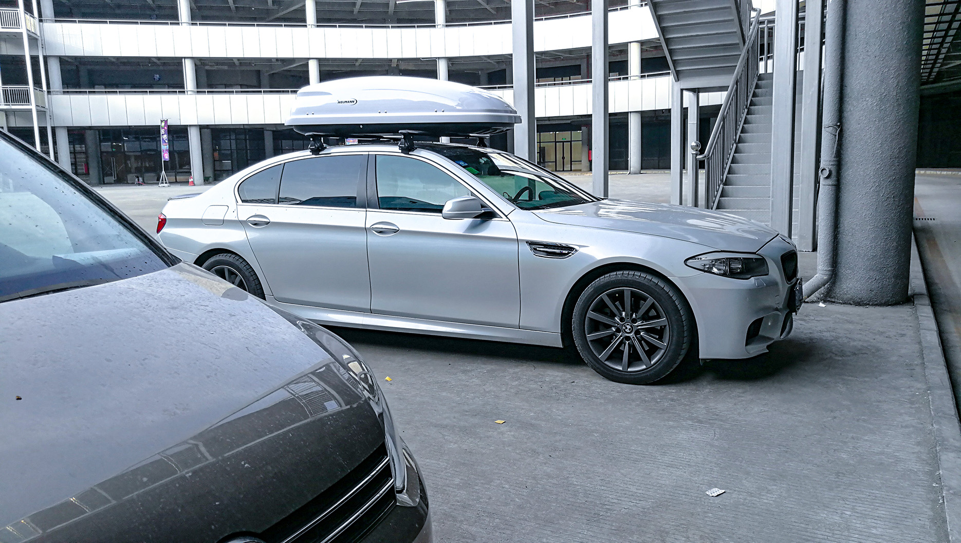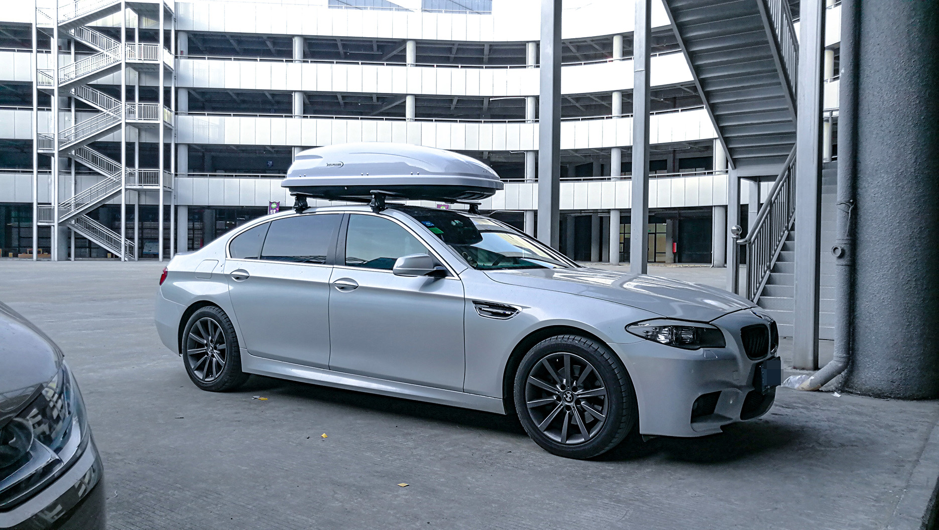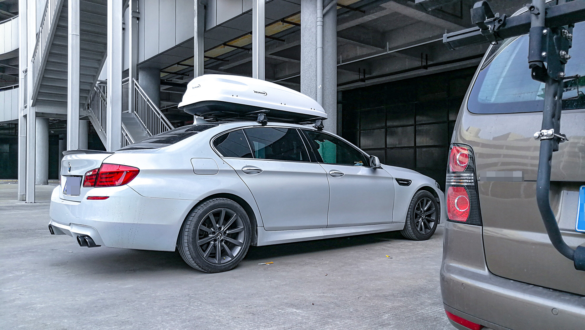 宝马5系搭载纽曼305s车顶行李架,纽曼D6大海豚车顶行李箱