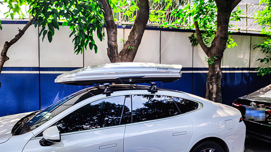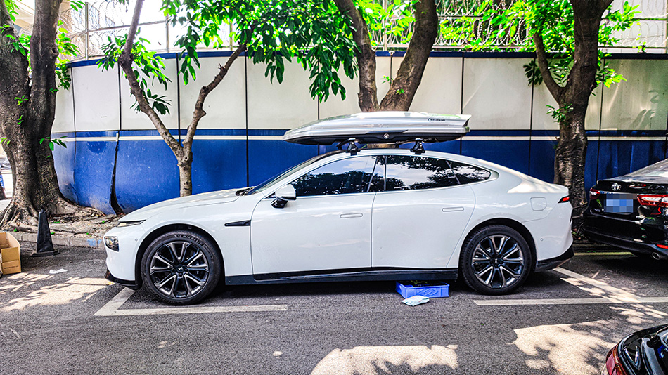 小鹏P7安装纽曼305s车顶行李架,G5车顶箱白色,质感好。
